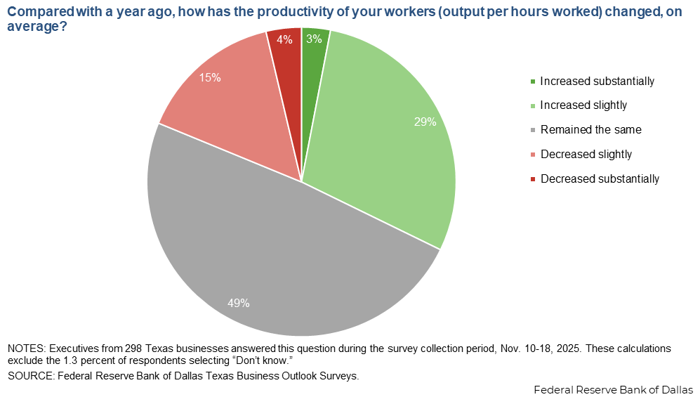 Worker productivity has increased for nearly a third of responding Texas businesses and declined for just under 20 percent. About half of respondents note no change in worker productivity over the past year.
