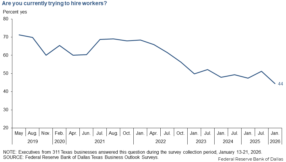 Forty-four percent of surveyed firms are currently trying to hire, down from 51 percent in July 2025 and representing the lowest share since this question was first posed in 2019.