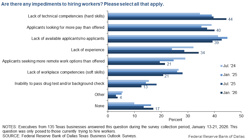 Lack of hard skills among applicants became the top hiring impediment, followed by applicants looking for more pay than offered. Lack of applicants retreated as an obstacle, while the share of respondents citing lack of experience increased.