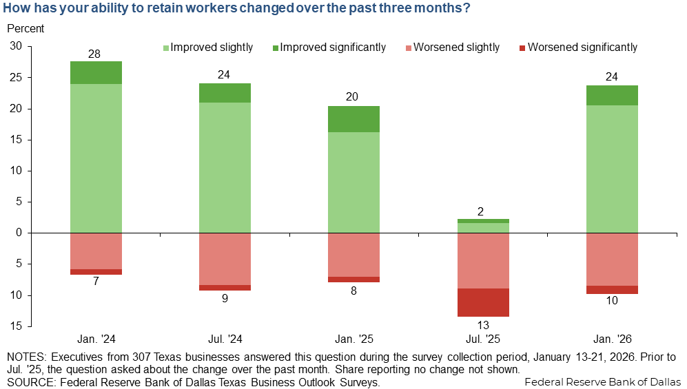 Worker retention has become easier over the past three months on net, a change from mid-2025, though the majority of firms (66 percent) notes no change in their ability to retain workers.