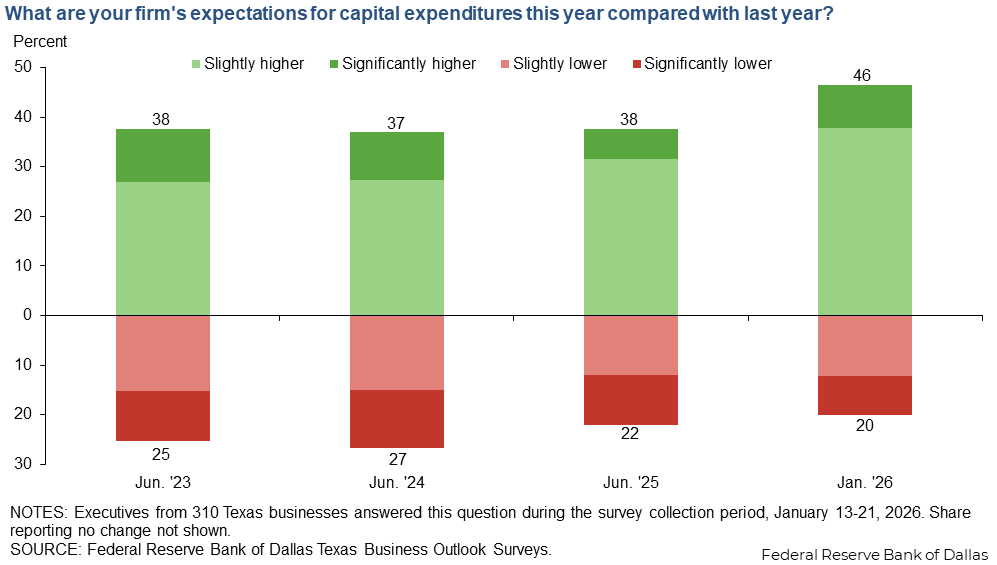 Of the Texas firms surveyed, 46 percent expect growth in capital expenditures this year, exceeding the 20 percent share expecting lower spending. This represents a more positive capital expenditures outlook on net than the prior two years, particularly in the manufacturing sector.