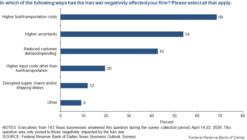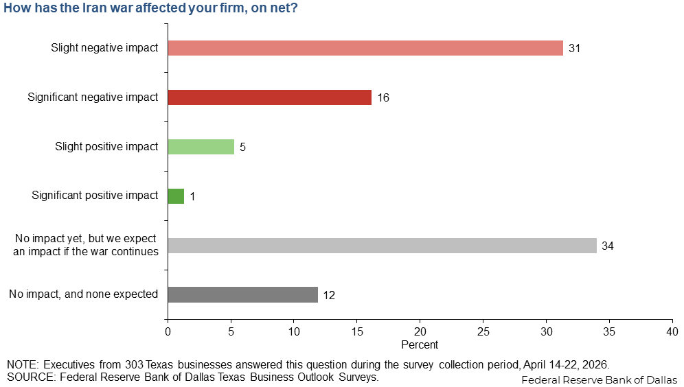For this month’s survey, Texas business executives were asked supplemental questions on the Iran war. Results below include responses from participants from both the Texas Manufacturing Outlook Survey and Texas Service Sector Outlook Survey.