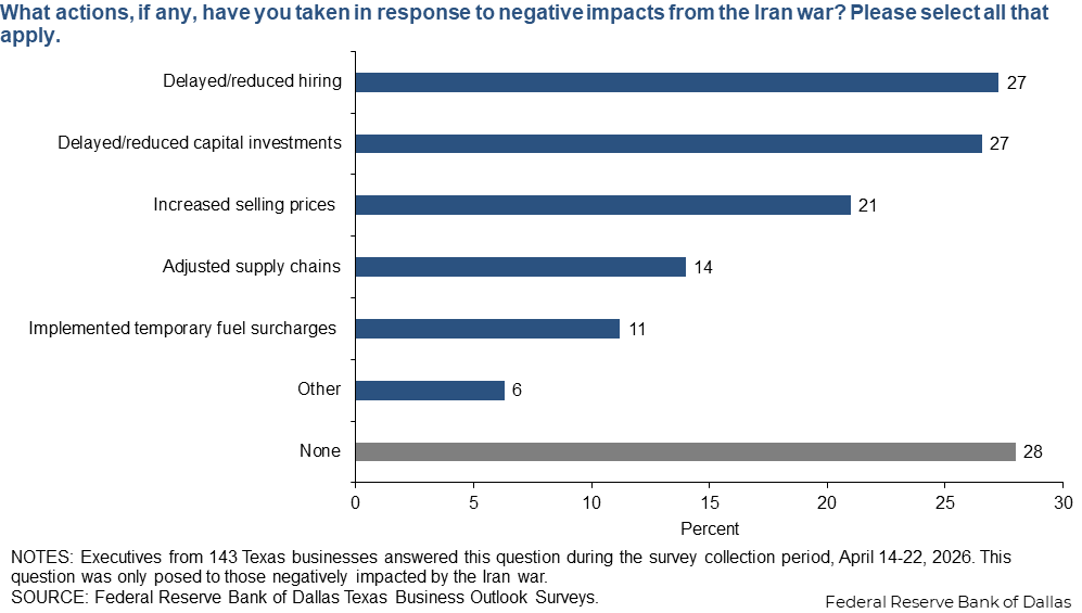Pullbacks in hiring and capital spending are the most common actions taken by firms surveyed, though increased selling prices was the top response among manufacturers. More than a quarter of firms negatively impacted by the Iran war have not taken action in response.