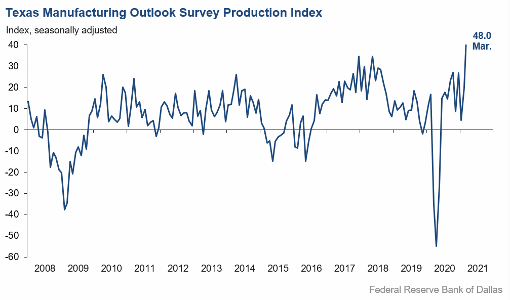 Texas factory activity expanded at a markedly faster pace in March, according to business executives responding to the Texas Manufacturing Outlook Survey. The production index, a key measure of state manufacturing conditions, surged 28 points to 48.0, its highest reading in the survey’s 17-year history.