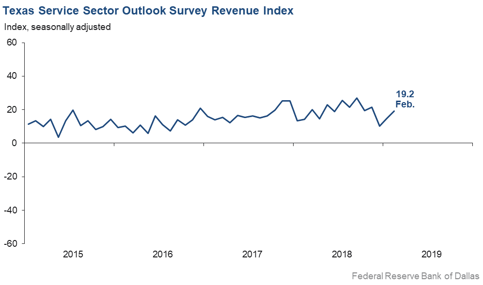 Texas service sector activity accelerated in February, according to business executives responding to the Texas Service Sector Outlook Survey. The revenue index, a key measure of state service sector conditions, rose from 14.9 in January to 19.2 in February.