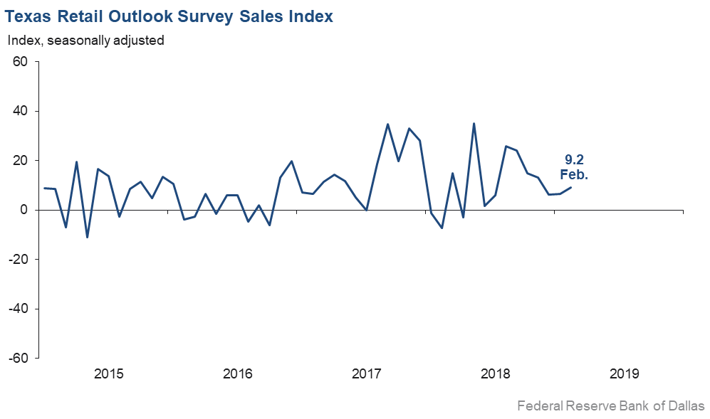 Retail sales accelerated in February, according to business executives responding to the Texas Retail Outlook Survey. The sales index increased from 6.5 in January to 9.2 in February. Inventory growth slowed but remained robust, with the inventories index declining from 19.0 to 13.6.