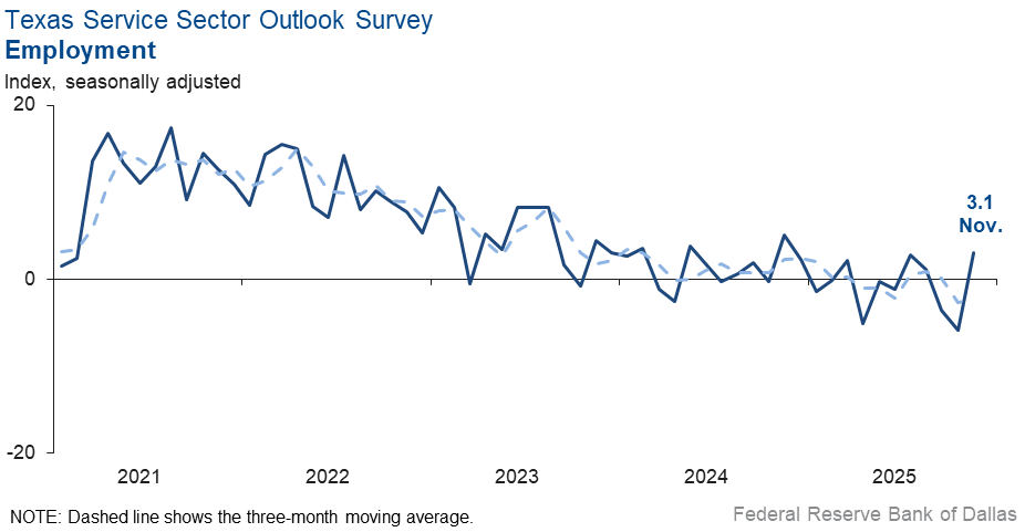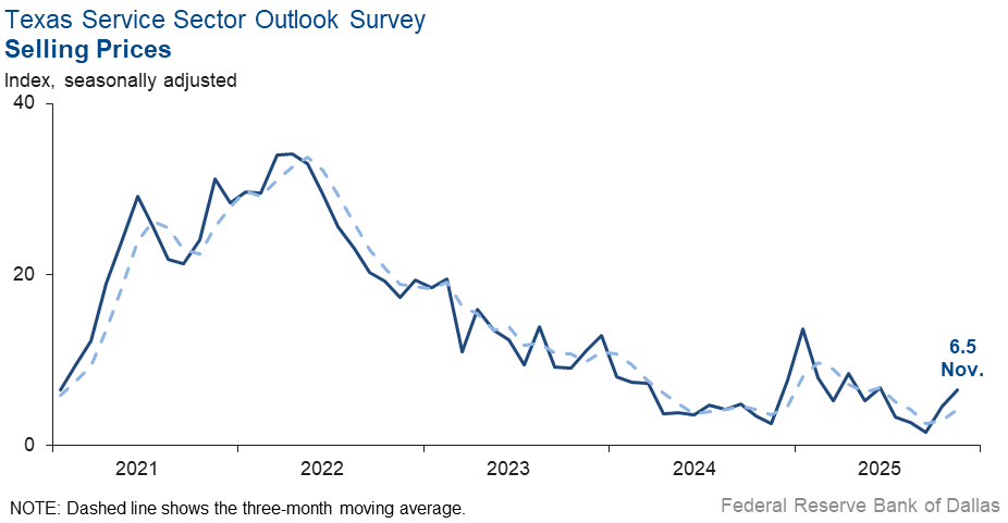 Data were collected Nov. 10–18, and 246 of the 346 Texas service sector business executives surveyed submitted responses. The Dallas Fed conducts the Texas Service Sector Outlook Survey monthly to obtain a timely assessment of the state’s service sector activity. Firms are asked whether revenue, employment, prices, general business activity and other indicators increased, decreased or remained unchanged over the previous month.