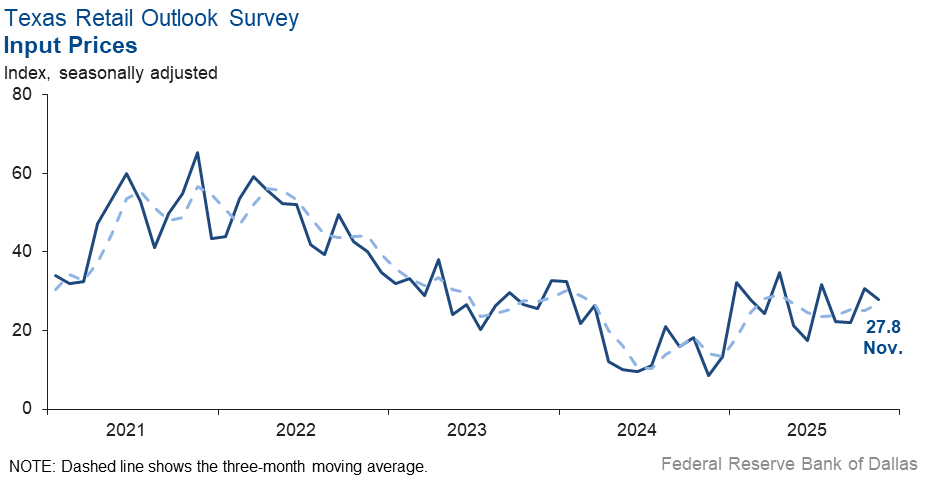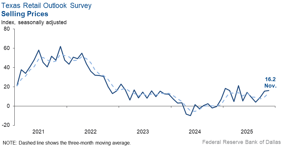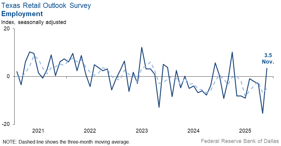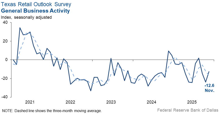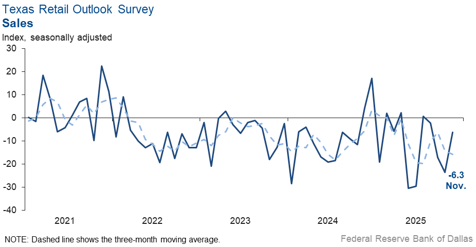 Retail sales dipped in November, according to business executives responding to the Texas Retail Outlook Survey. The sales index, a key measure of state retail activity, remained negative but increased 17 points to -6.3. Retailers’ inventories increased, with the index rising seven points to 7.4