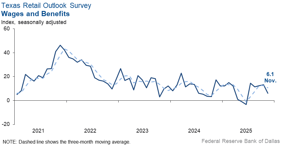 Wage pressures eased this month, while price pressures were little changed. The input prices index dipped three points to 27.8 but remained above the series average of 22.6. The wages and benefits index also fell to 6.1 from 13.3 in October. Meanwhile, the selling prices index was little changed at 16.2.